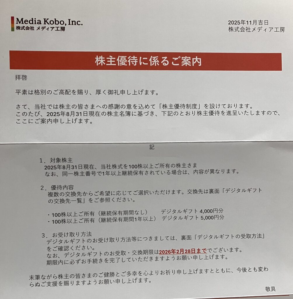 基本情報技術者試験の勉強も遅々として進まず、胃カメラの結果も問題なし。なので最近きた株主優待をあげていくよ。