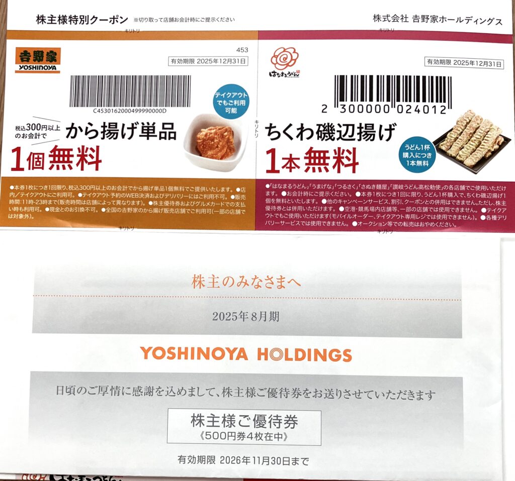 吉野家ホールディング株主優待2000円+から揚げ磯辺揚げ無料券